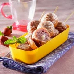 - Tusukkan dengan tusuk sate. Coret-coret dengan cokelat masak putih.